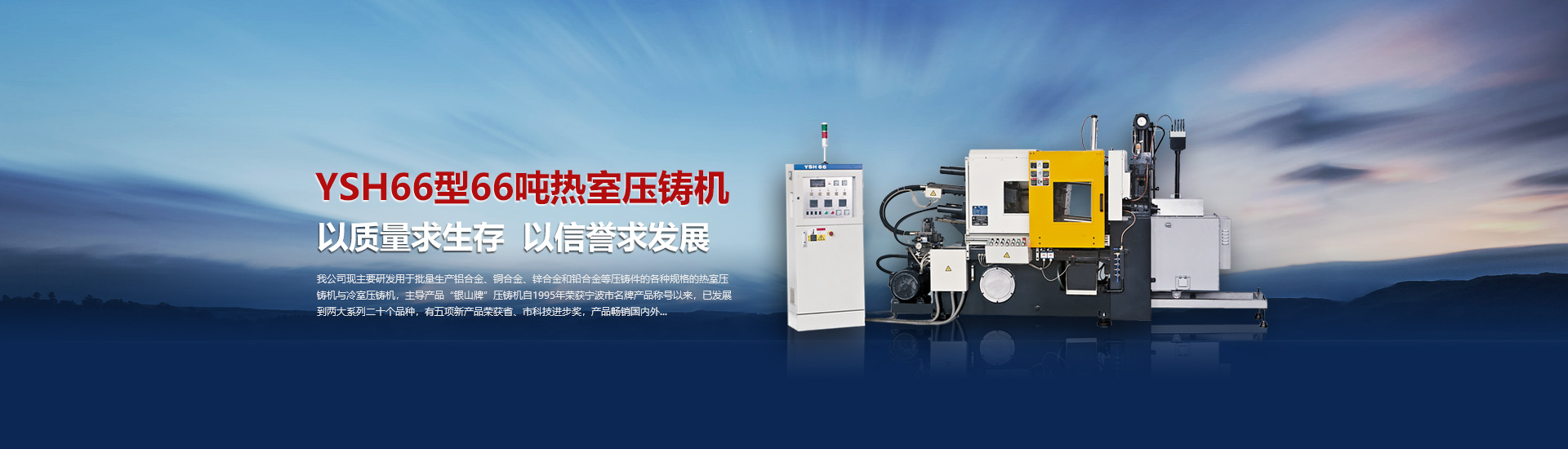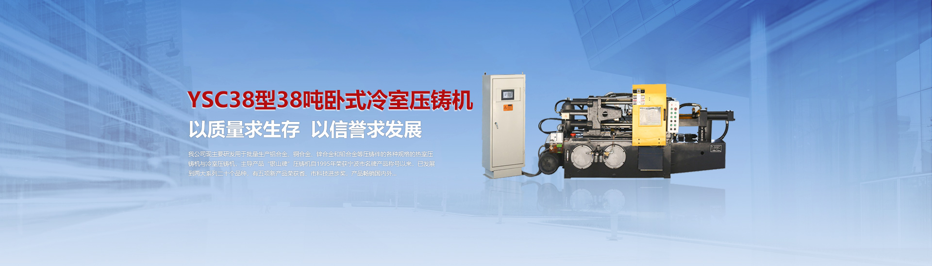 我司現(xiàn)主要研發(fā)用于批量加工生產(chǎn)鋁合金、銅合金、鋅合金和鉛合金等壓鑄件的各種型號規(guī)格的熱室/冷室壓鑄機,主導(dǎo)產(chǎn)品“銀山牌”壓鑄機自1995年榮獲寧波市名牌產(chǎn)品稱號以來,已發(fā)展到兩大系列二十個品種,有五項產(chǎn)品曾榮獲省、市科技進步獎,產(chǎn)品暢銷國內(nèi)外。歷年來向用戶提供了8000余臺設(shè)備,為中國的壓鑄工業(yè)發(fā)展作出了重要的貢獻,企業(yè)獲得了很高的信譽度。